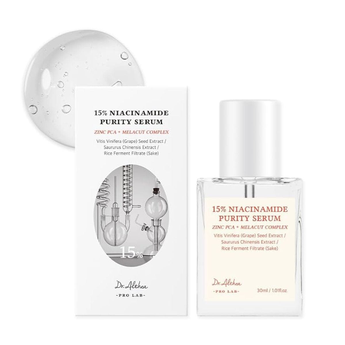 سيروم Dr.Althea 15% Niacinamide Purity هو سيروم نباتي عالي الأداء تم اختباره سريرياً، ويعمل على توحيد لون البشرة، تصغير المسام، وتحسين ملمسها بشكل واضح. يحتوي على تركيز عالٍ بنسبة 15% من النياسيناميد، ويعد الخيار المثالي لمن يبحث عن حل فعال لتفتيح البشرة وتقليل مظهر المسام الواسعة.