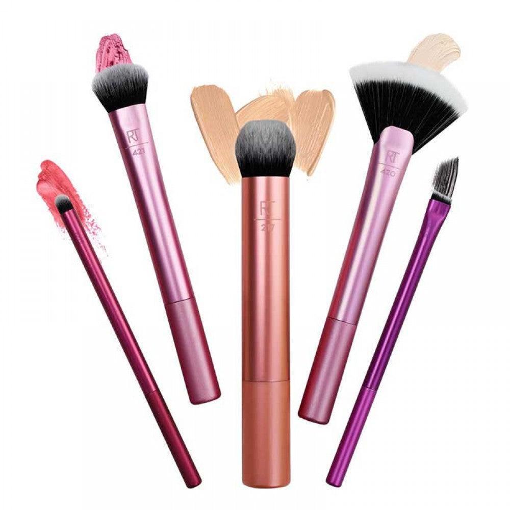 The following brushes are included in the brush set. Expert edge large (RT 217) features a symmetrical cut with five distinct edges that can be used to precisely apply liquid or cream foundation and contour makeup. Soft accent (RT 421) features a soft, tapered cut that can be used to blend cream highlighter or blush. Spotlight fan (RT 420) features a precision fan shape that can be used to gently glide powder contour makeup or highlighter. RT 317 features thin, angled bristles that can be used to apply and smudge liquid liners